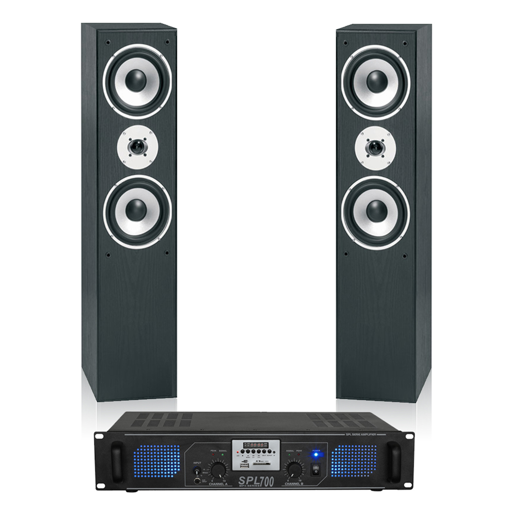 A fantastic package bundled together, ideal for home audio set-ups, public houses and more! Including a pair of Skytronic 350 watt (each) tower speakers, with 3-way bass reflex system. A SkyTec 2 x 350 Watt PA amplifier for semi-professional use that shouldn't miss in any DJ, bar or home installation. The amplifier is fitted with an FM Tuner and several RCA inputs for various audio sources such as DVD player, TV, CD player, etc. Connect your laptop, mp3/ cd player with the Y connection audio cable supplied. All speaker cable is included. A fantastic pair of 3-way Bass Reflex Hi-Fi speakers with a wide frequency range of 28Hz to 22kHz, a range where many speakers can not match. Because of the great characteristics of these speakers, the set has a formidable sound. These tall-boy floor standing speakers are ideal for home audio stereo and cinema theatre set-ups, providing you with an almost true cinema experience in sound, also great for gaming enthusiasts and more! BBA0318 - 2x Fenton Passive 3-Way HiFi Tower Speakers 350W This fantastic pair of 3-way Bass Reflex speakers from Fenton make a sure addition or upgrade to your current Hi-Fi or home cinema system, boasting a frequency range of 28Hz to 22kHz these speakers can reproduce sound that others like them find hard to match. Their floor standing design, two 6.5" drivers and Neodymium tweeter per speaker, and the 350W of max power available across the pair of speakers will make for a truly great cinematic experience, an excellent sound system for a house party or help bring your gaming experience to life. The black wood boxes with removable front grilles make these stylish speakers a pleasure to look at, and easy to fit into your interior decor. Features