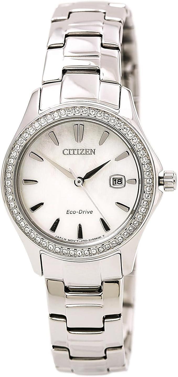 Citizen Women's ECO WR050 Stainless Steel Bracelet White Finish:: Citizen Women's ECO WR050 Stainless Steel Bracelet maintains a classic look. The combination of traditional lines and Swarovski crystals makes this a perfect watch for young and old alike. The dial features a date window, and the Eco-drive movement is powered by light, so no batteries are needed.