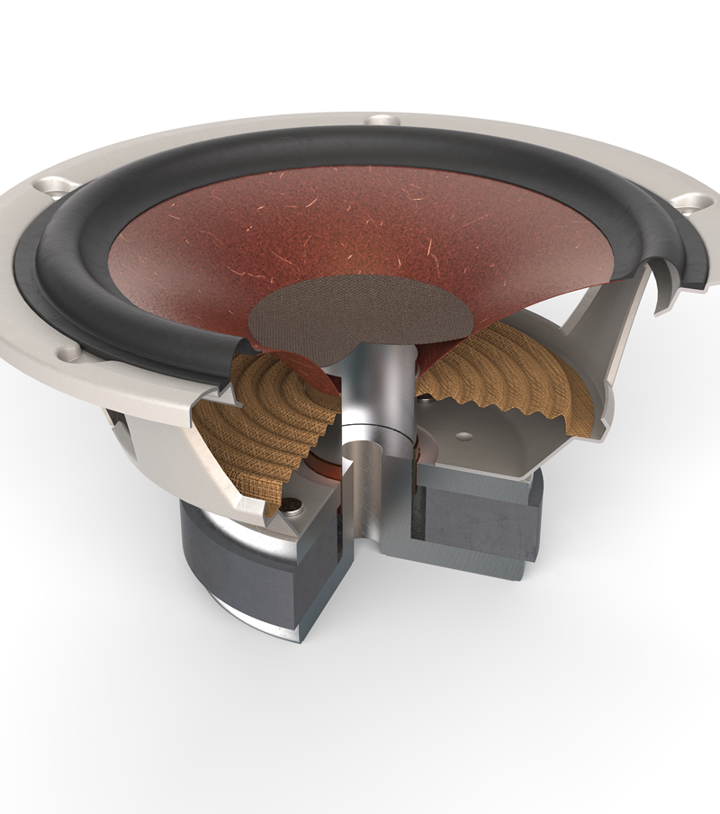 Combining the well-behaving wood fibre cone with the low-loss rubber surround and spider suspension results in the reproduction of even the smallest micro-detail in the signal – unfiltered and with high accuracy.