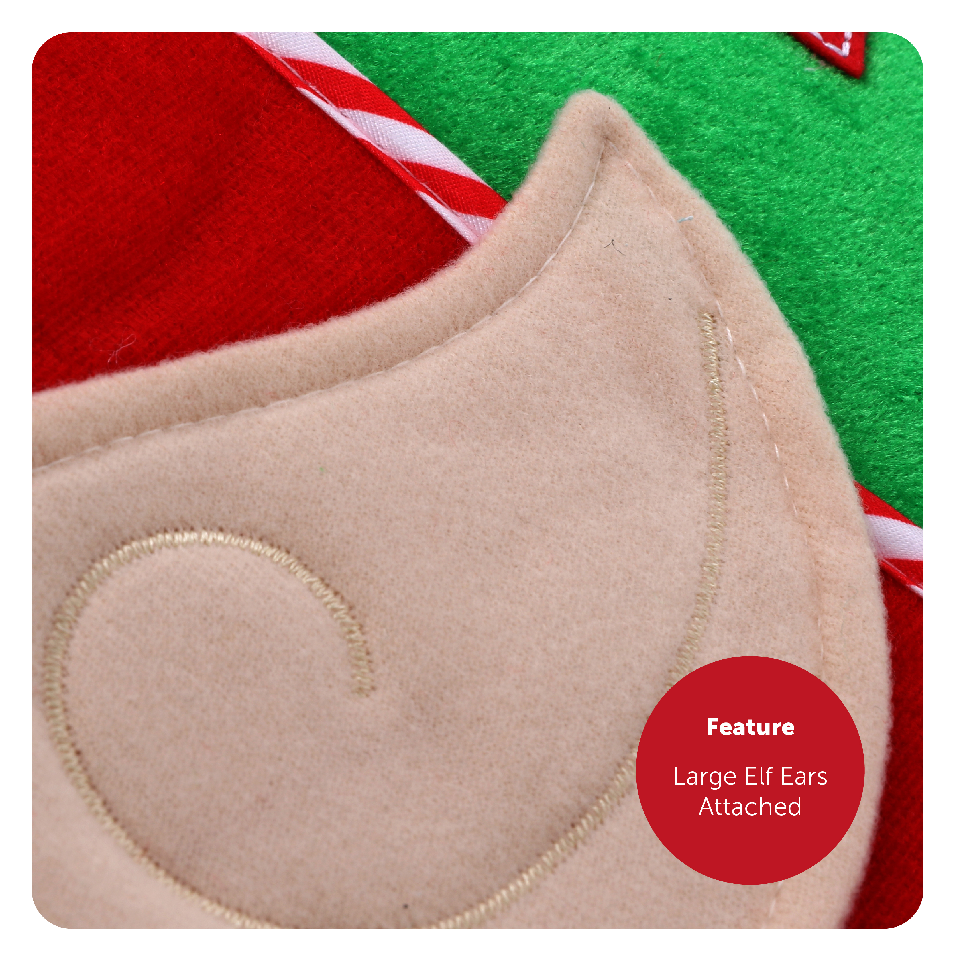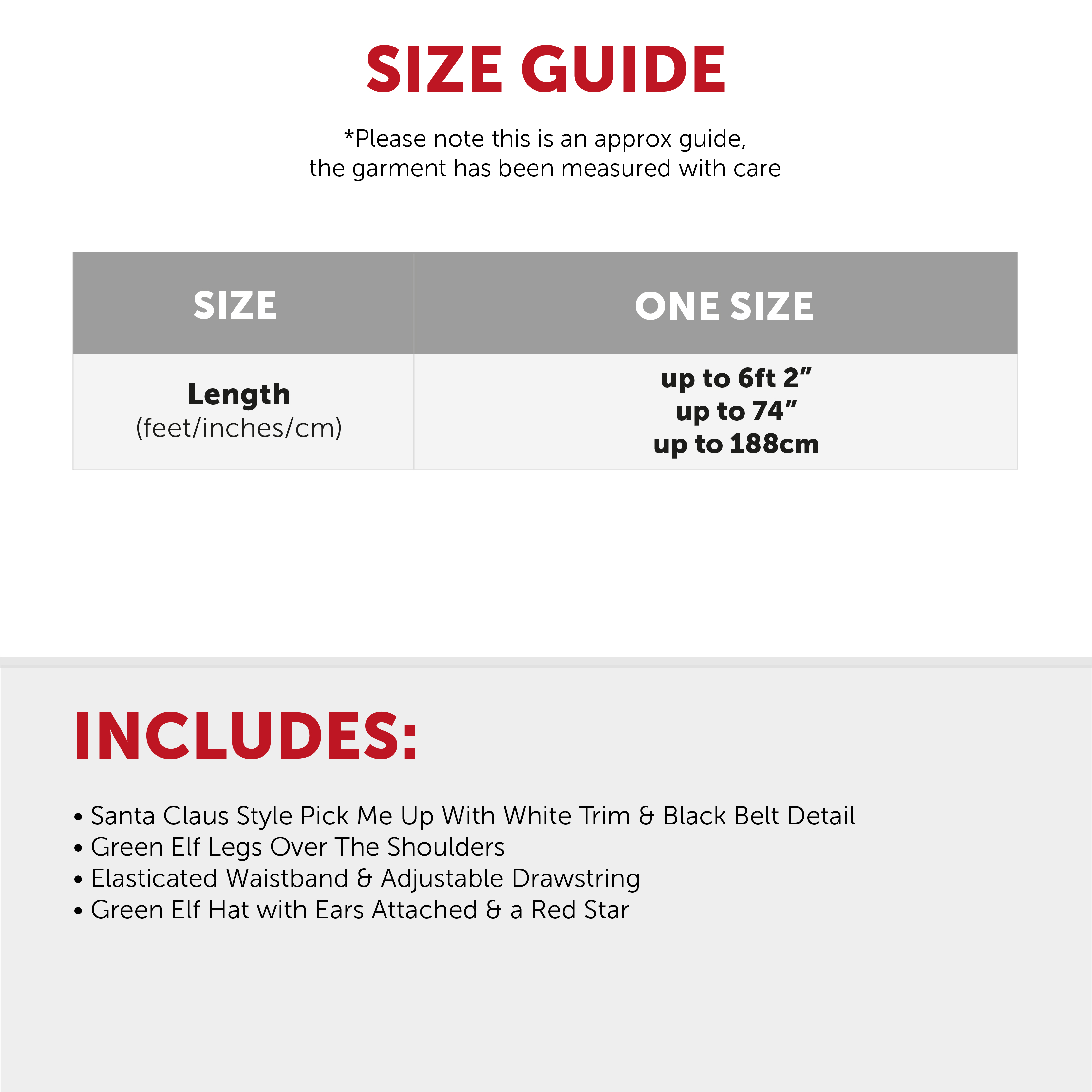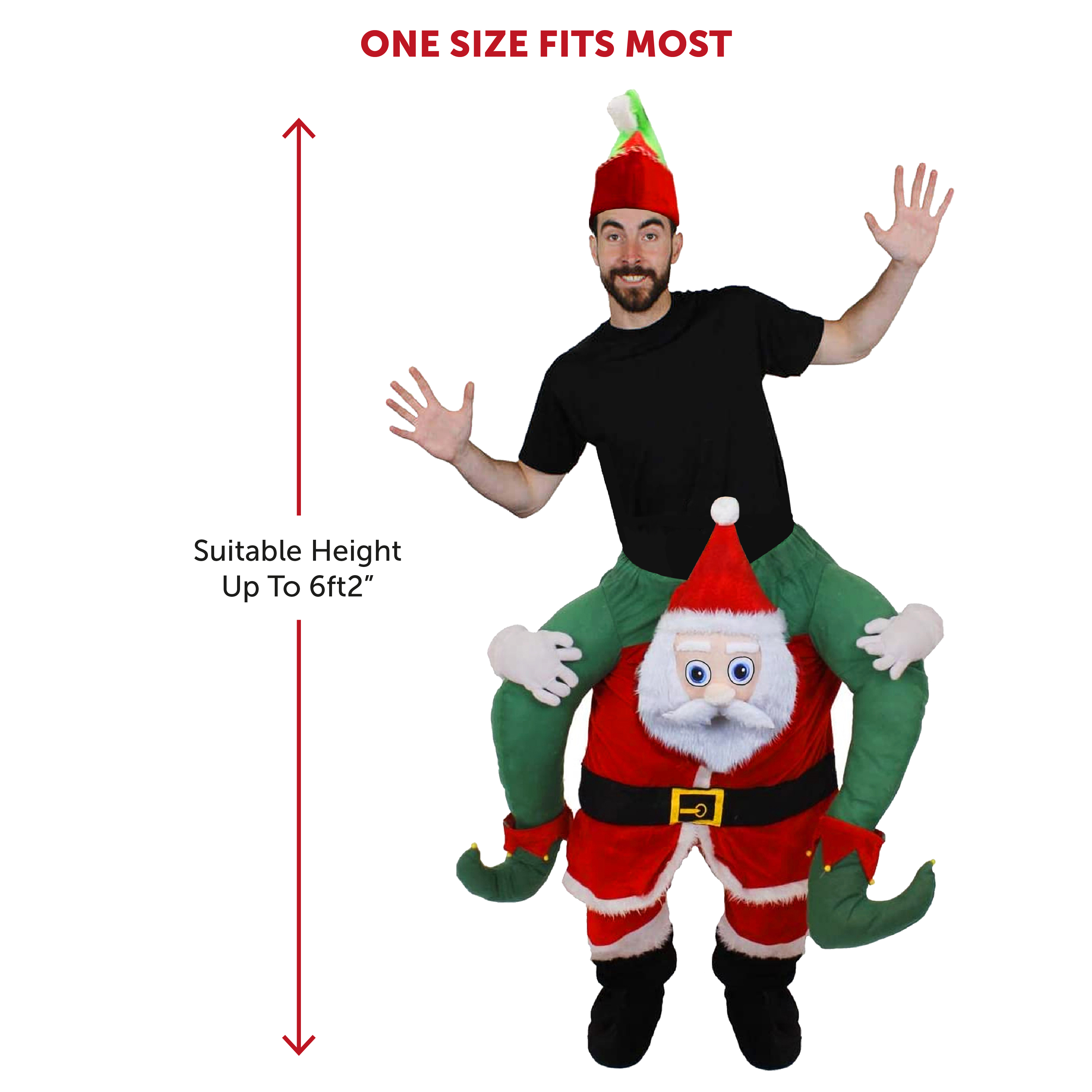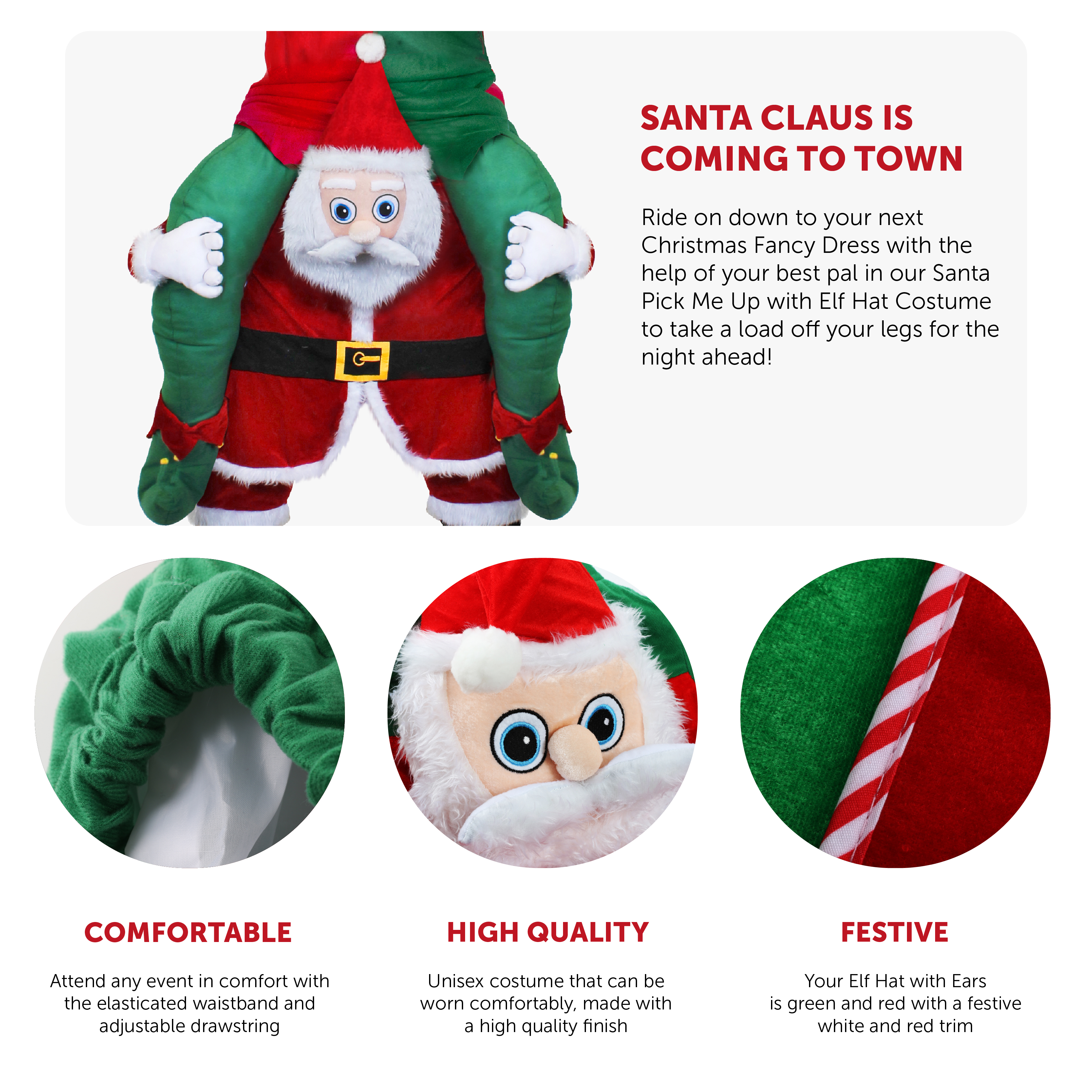 COSTUME INCLUDES: Your Costume includes a large Green Elf Hat with Red edging, a Red Star on the front, a White Pom-Pom on the tip and Elf Ears, and a quality Santa Claus Pick Me Up costume, with high-quality trousers with a soft, plush Santa head and arms, along with attached padded fake Elf legs over Santa's Shoulders!, to complete the look!