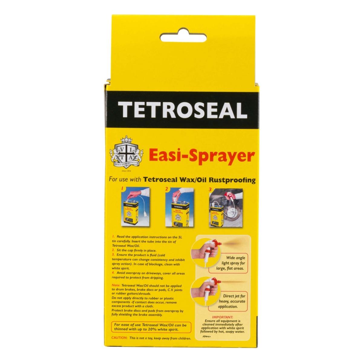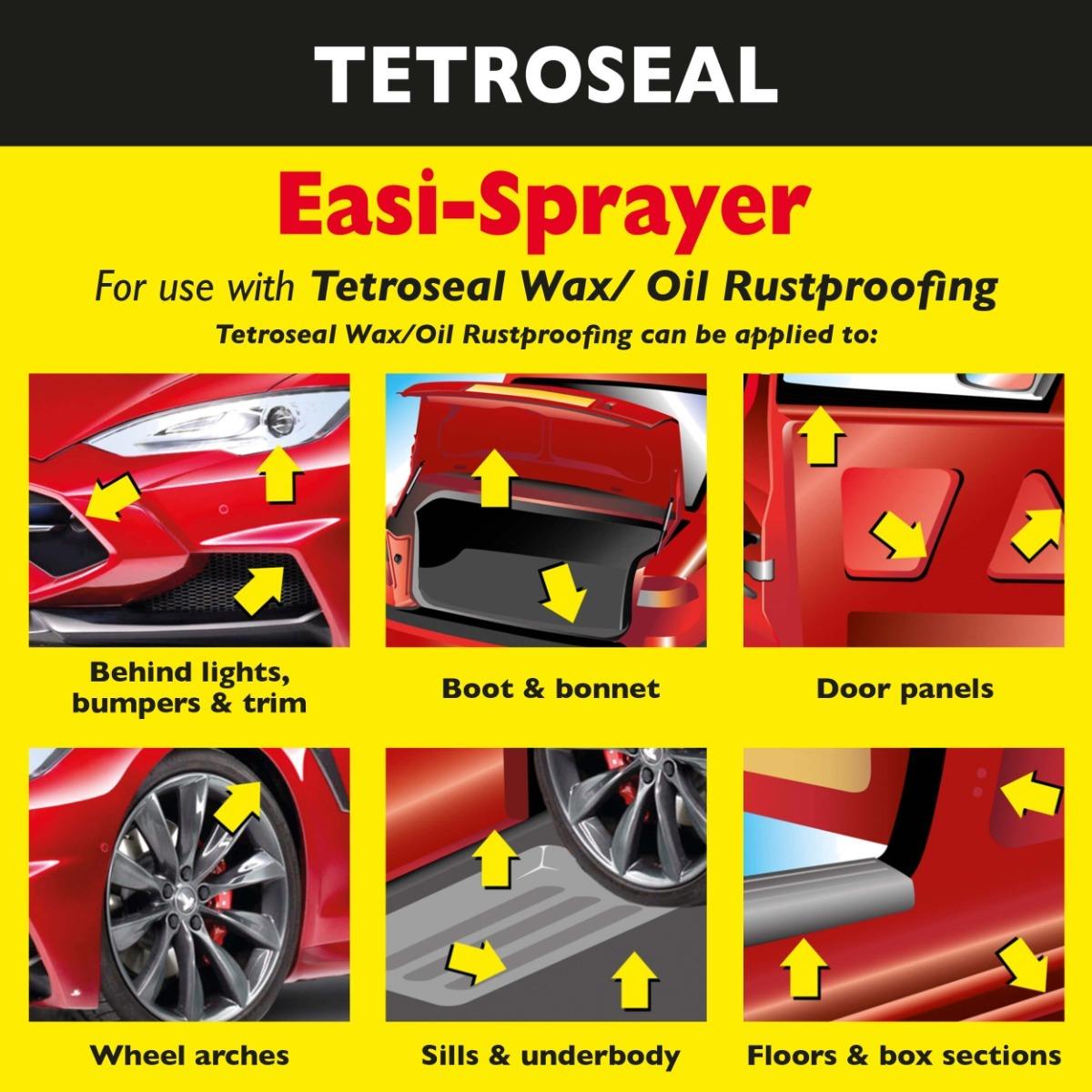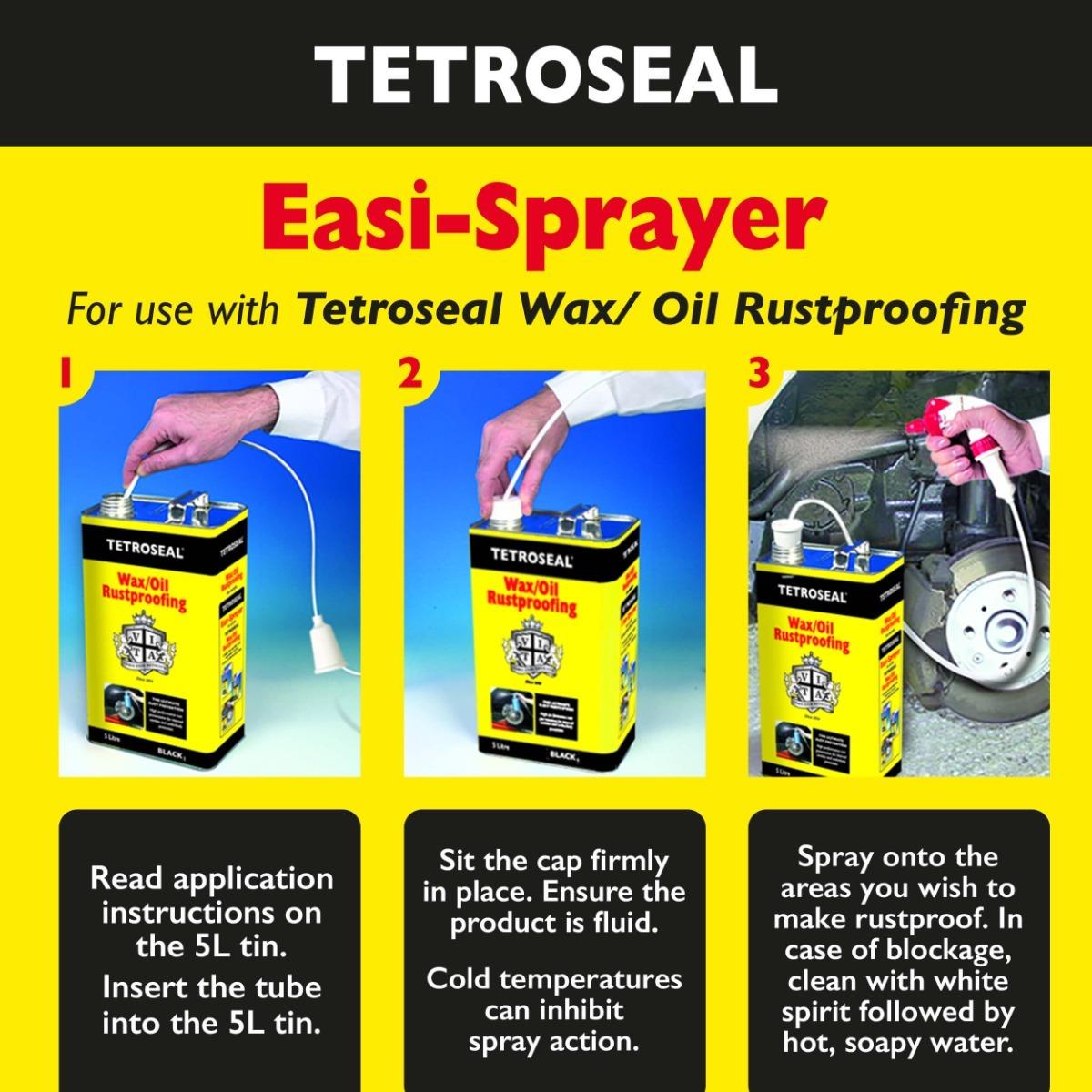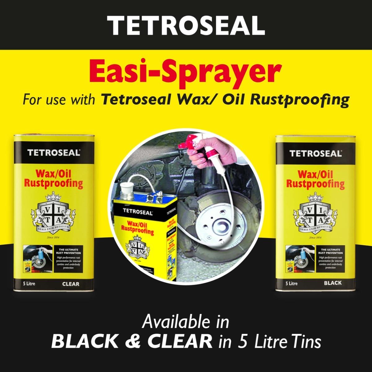 - For trade use, spray at a pressure of 70-90 psi (bar 5/6) and at a distance of 30-50cm. For smaller applications/DIY use, a trigger spray is recommended. Tetroseal Wax/Oil may also be applied with a brush.