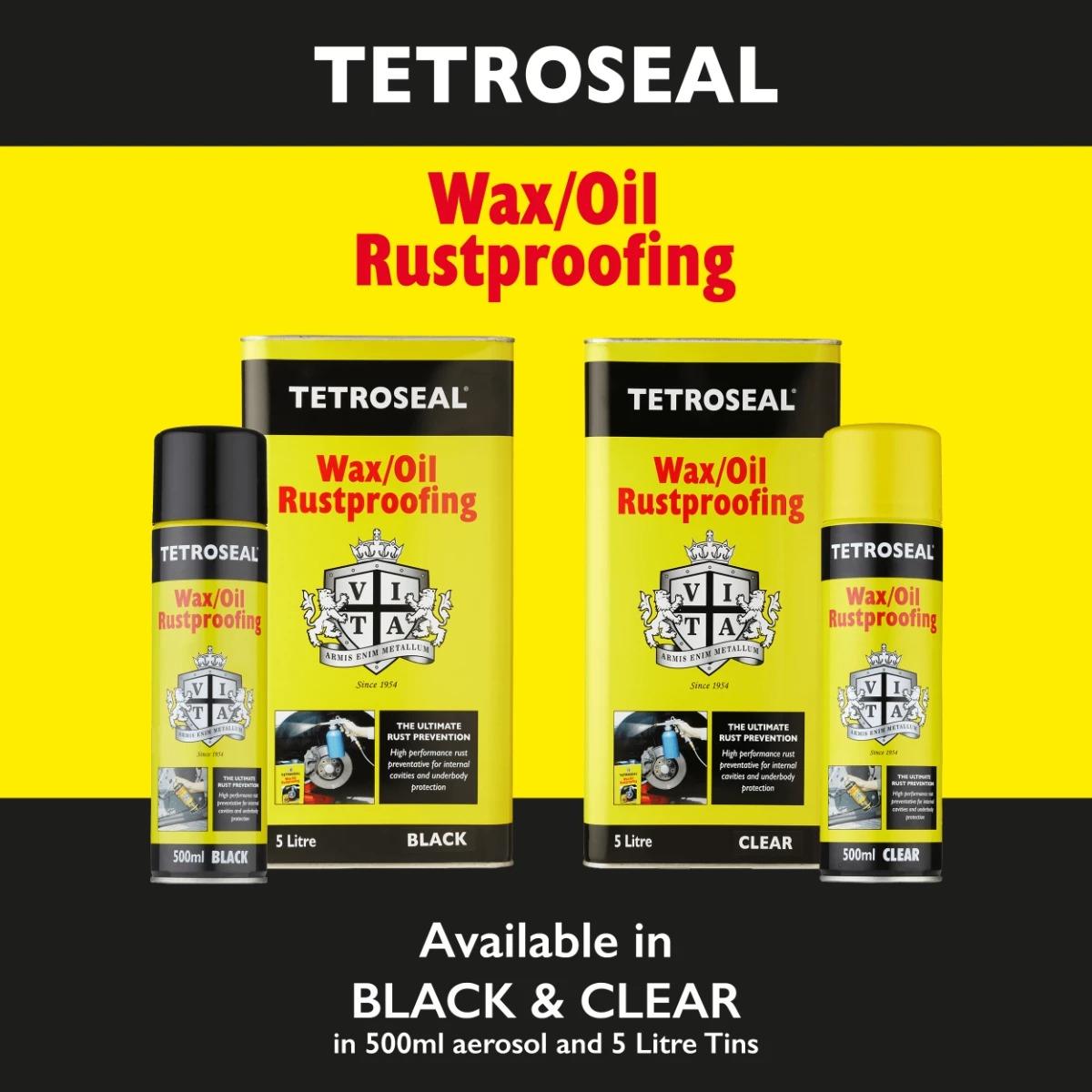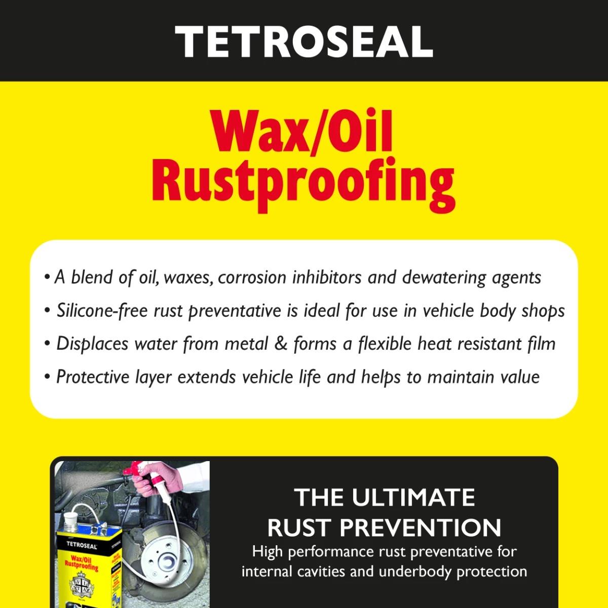 Tetroseal Wax/Oil Rustproofing is a powerful blend of oil, waxes, corrosion inhibitors and dewatering agents, combining to form a heavy duty rust preventative. It is designed to kill old rust and provide all-round internal rust protection for automotive vehicles, as well as equipment and machinery exposed to outdoor weather conditions. Tetroseal Wax/Oil displaces water from metal surfaces and vehicle crevices and forms a flexible heat resistant film which will not re-run on the inside of panels, extending the vehicle life and helping to maintain value. Silicone-free for use in vehicle body shops.
