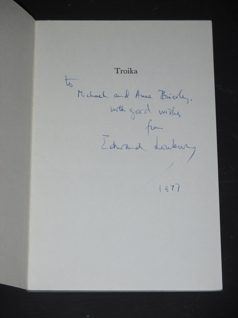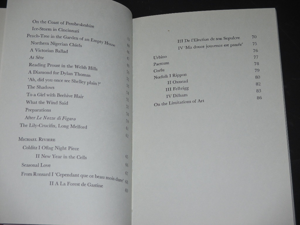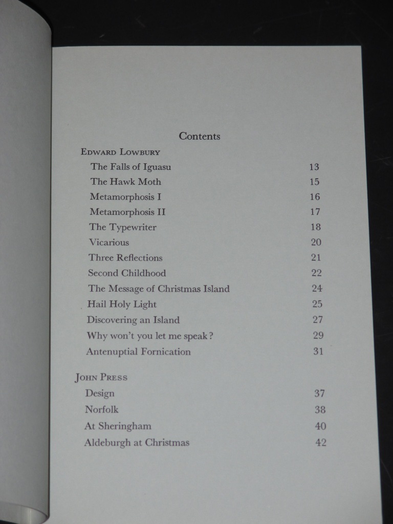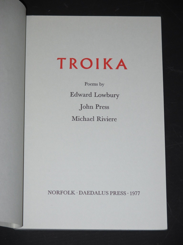 Troika Poems by Edward Lowbury, John Press, Michael Riviere [SIGNED] By Edward Lowbury / John Press / Michael Riviere Norfolk: Approx Size: 4.75 x 7.25 inches (12.5 x 18.5 cms) Paperback. 86 printed pages Dust Jacket: Slight fading to spine and edges, light mark to front cover. Overall Condition is Very Good + Book: Plain card wraps, excellent condition throughout. Inscribed and signed by co-author to the half title page: 'To Michael and Anne Brierley, with good wishes from Edward Lowbury, 1977.' Overall Condition is Near Fine There are many more rare and collectable books in our eBay shop, all at very reasonable prices Why not take a look... HERE ![]() You may also like |